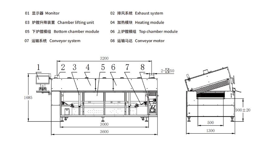 | 1.可選:機頭機尾可凸出,凸出上爐膛外側(cè)面尺寸300mm(整機尺寸會加長600mm)。 2.注明:根據(jù)產(chǎn)能要求,推薦溫區(qū)數(shù)量優(yōu)先選擇:4溫區(qū)、5溫區(qū)、 8溫區(qū)、9溫區(qū)、10溫區(qū)、12溫區(qū),可定制。 | |||