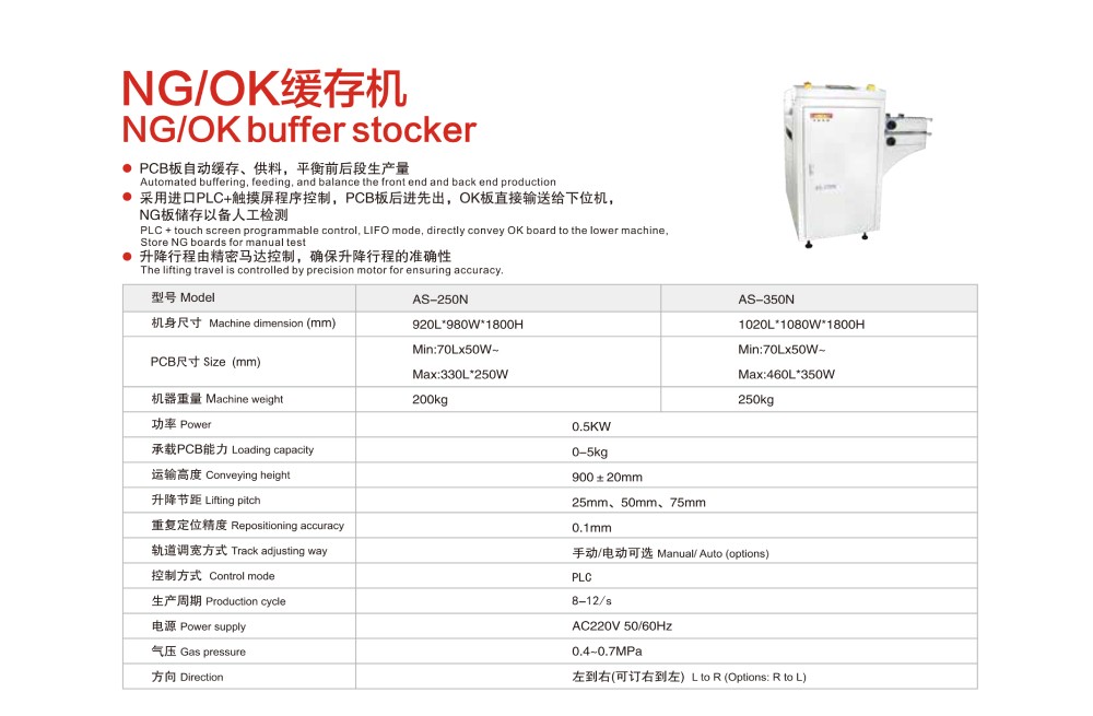 NG/OK緩存機介紹:PCB板自動緩存、供料,平衡前后段生產(chǎn)量;采用進口PLC+觸摸屏程序控制,PCB板后進先出,OK板直接輸送給下位機,NG板儲存以備人工檢測;升降行程由精密馬達控制,確保升降行程的準確性;