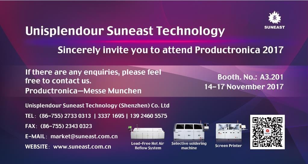 2017年11月14日至17日,Productronica2017將在德國慕尼黑新國際博覽中心舉行。屆時(shí),日東科技將攜帶選擇性波峰焊SUNFLOW3、回流焊SER706A、全自動錫膏印刷機(jī)SL120亮相Productronica2017展會,歡迎大家蒞臨A3.201展臺參觀。