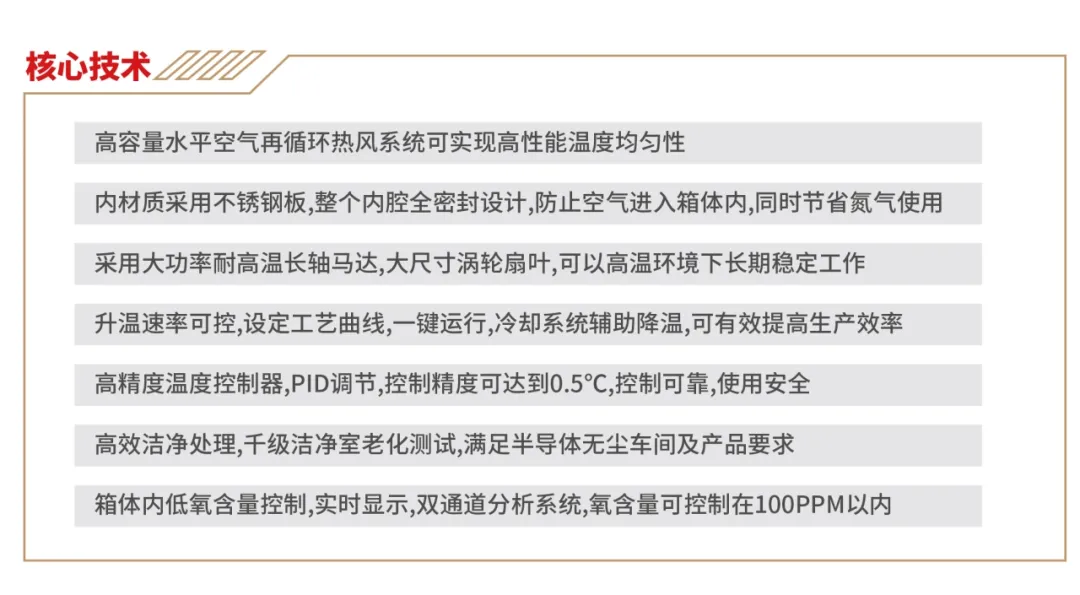 日東科技SEO系列半導(dǎo)體充氮烤箱通用性強(qiáng),通過充入氮?dú)鈱⒖鞠渲械难鯕馀懦觯乐购婵靖邷禺a(chǎn)生氧化現(xiàn)象。設(shè)備采用高容量水平空氣再循環(huán)系統(tǒng),采用專有的腔室結(jié)構(gòu)和密封技術(shù),具有出色的氣密性和溫度均勻性,滿足半導(dǎo)體產(chǎn)品高性能要求,適用于固化半導(dǎo)體晶圓、IC封裝(銅基板,銀膠,硅膠,環(huán)氧樹脂)、玻璃基板等產(chǎn)品烘烤。