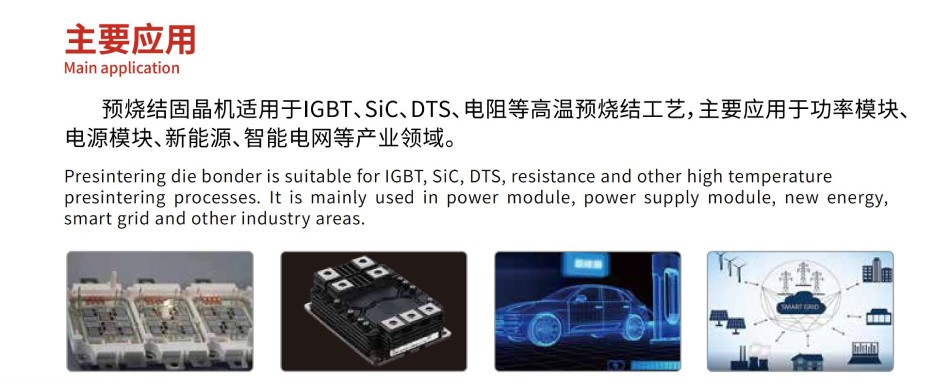 預燒結固晶機適用于IGBT、SiC、DTS、電阻等高溫預燒結工藝,主要應用于功率模塊、電源模塊、新能源、智能電網等產業領域。